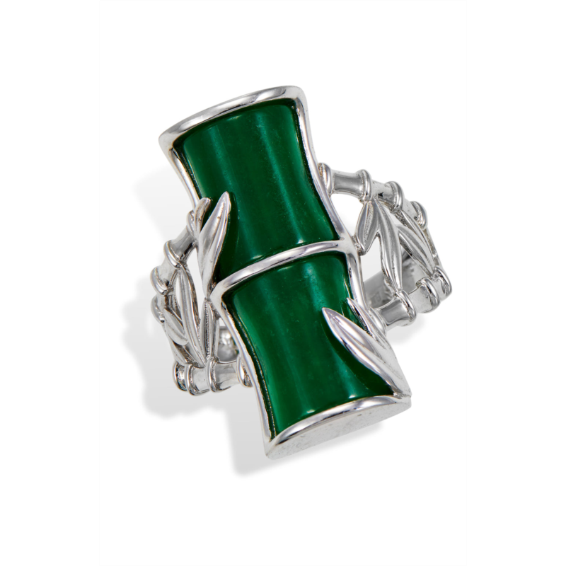 Sterling Silver Jade Bamboo Ring. Approx. .75'' in length. This statement ring features a jade center in a bamboo textured silhouette and will not go unnoticed!