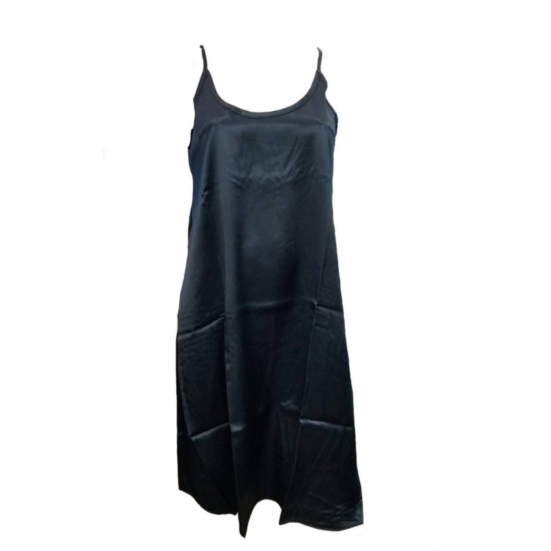 [US] PJ Harlow ruby satin knee length gown with spaghetti straps & gathered back in black