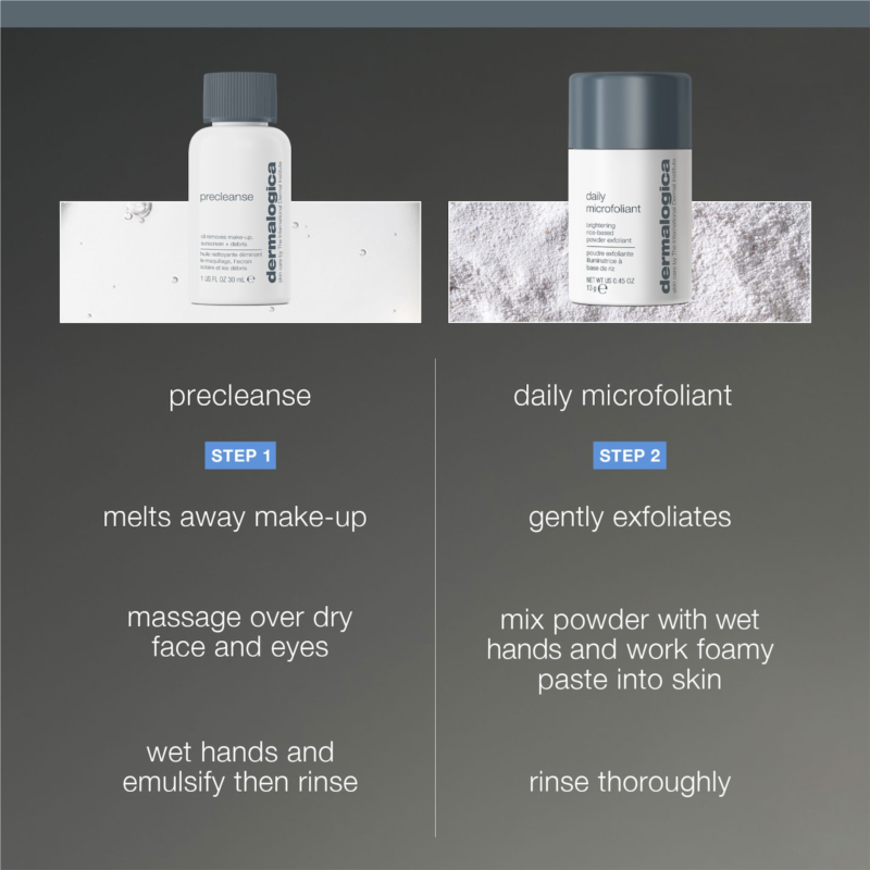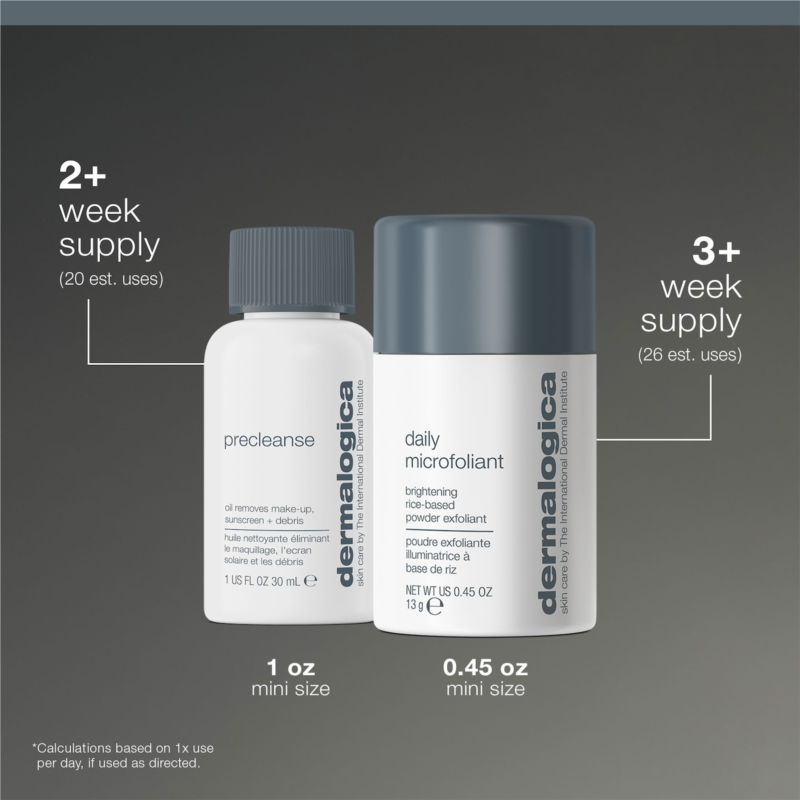 What Else You Need to Know:Experience a two-step power cleansing duo. This travel-friendly set of Dermalogica''s iconic formulas works to reveal clean and bright skin. PreCleanse is a deep-cleansing vegan oil that removes stubborn makeup and impurities from skin and Daily Microfoliant activates upon contact with water to gently exfoliate, leaving skin smoother and brighter.