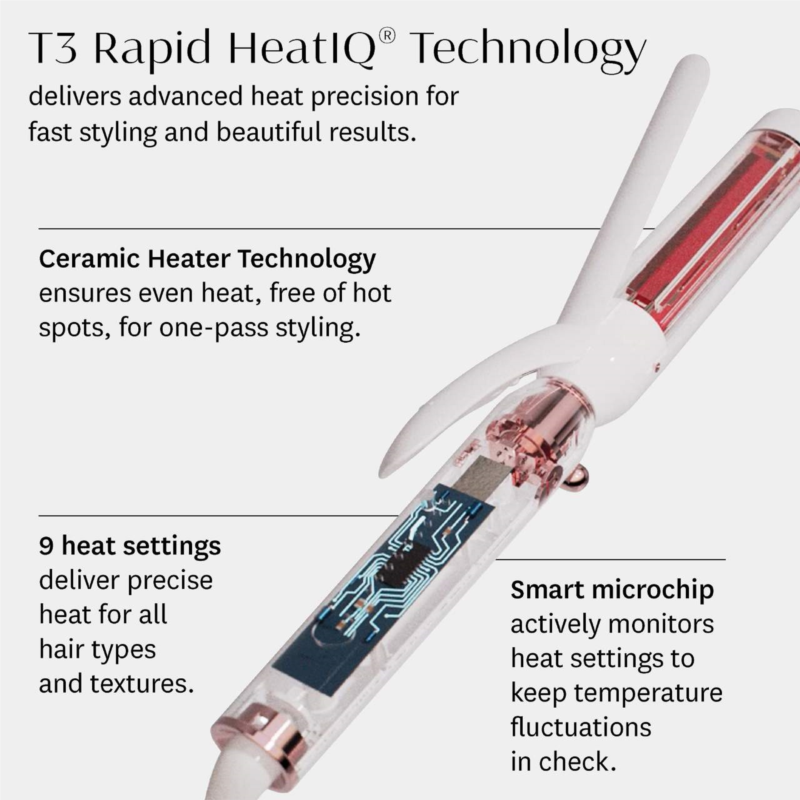 What Else You Need to Know: The T3 Switch Kit Curl Trio features three interchangeable barrels that take your curls from bouncy, to lived-in, to big and bold. Engineered with a smart microchip, 9 heat settings, and high-performance ceramic heaters, T3 Rapid HeatIQ technology ensures advanced heat precision for lasting results in one smooth pass. A powerful ion generator pairs with custom-blend CeraGloss ceramic barrels to create a shiny, frizz-free finish.