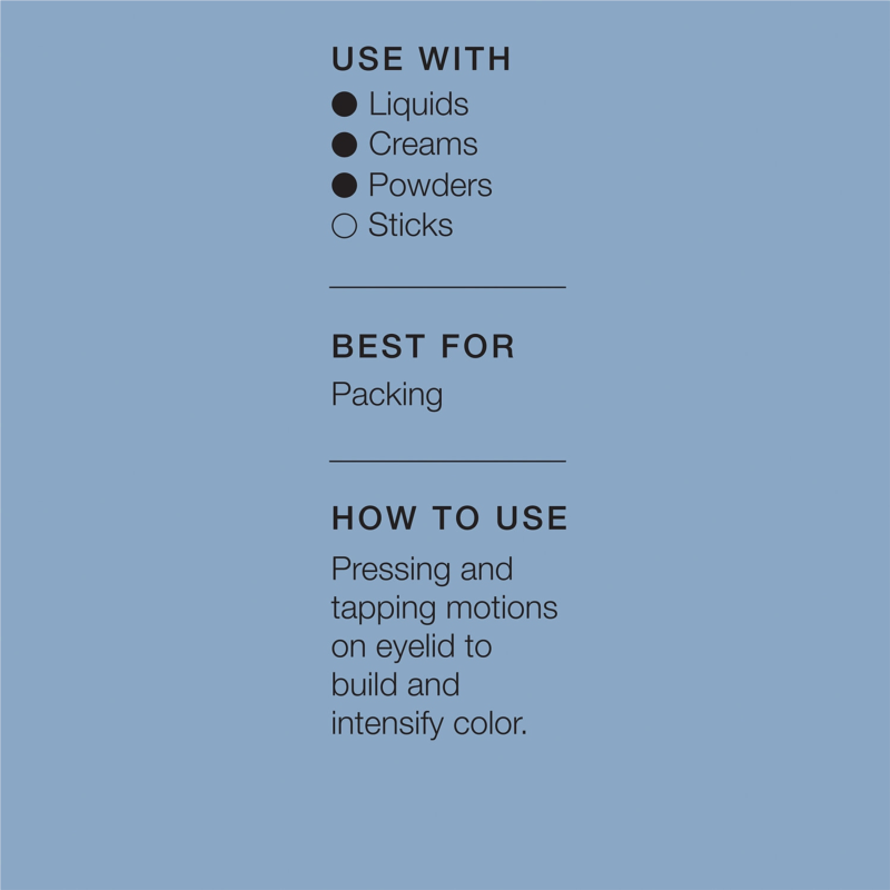 What Else You Need to Know: Pack and intensify pigment on eye lid with this flat and densely packed brush while reducing fallout and receiving high pigment payoff. The slightly angular shape allows you to get into smaller areas like the very inner corners of eyes. The small flat brush head allows for precision packing of powder and cream shadows. Use this brush to apply any formula of highlighter to the inner corners of eyes to brighten and open up the eyes.