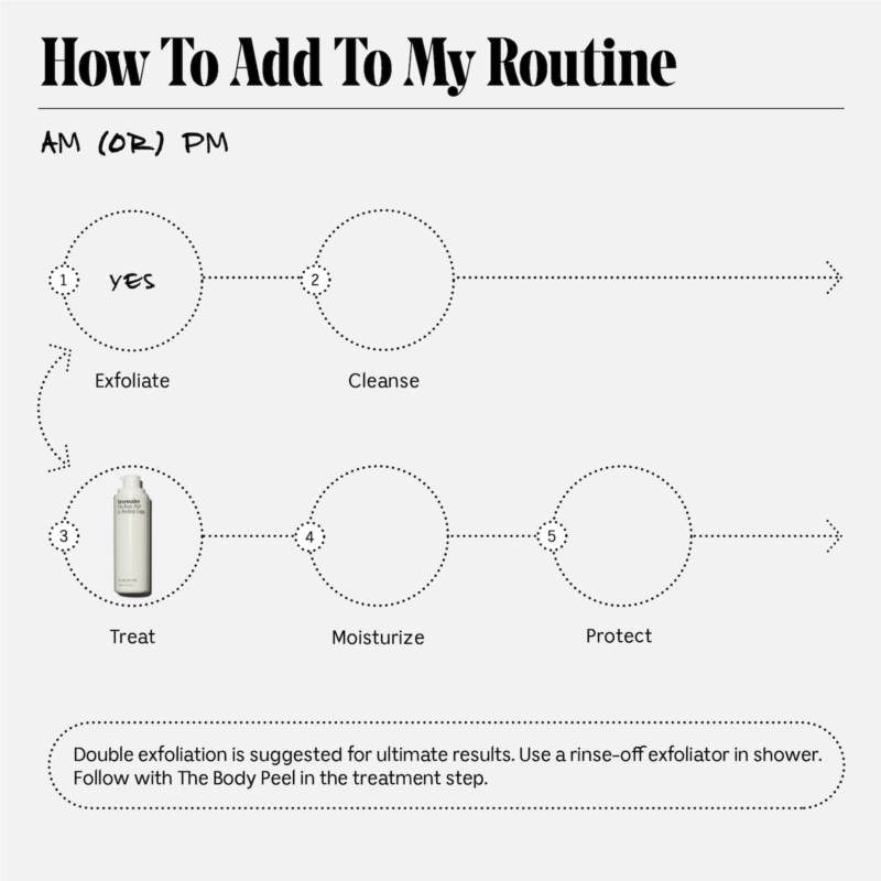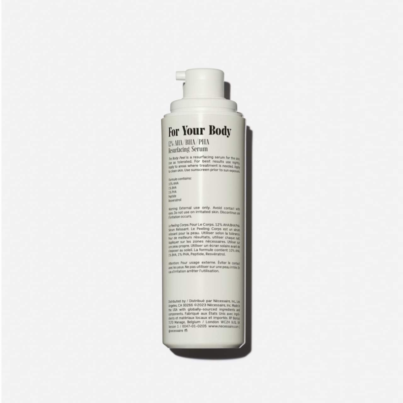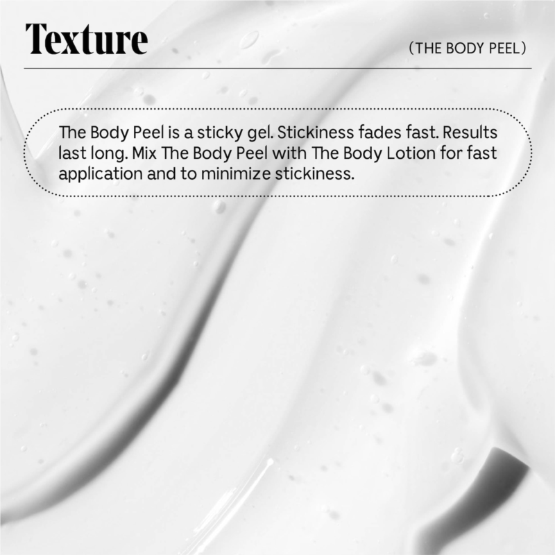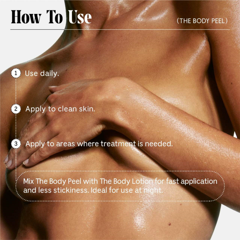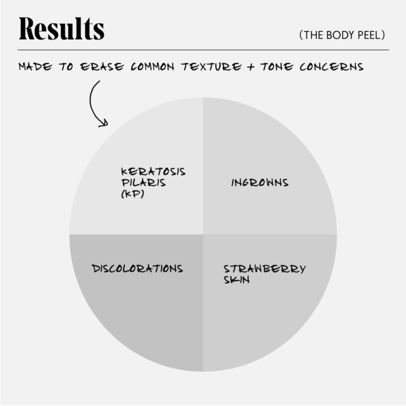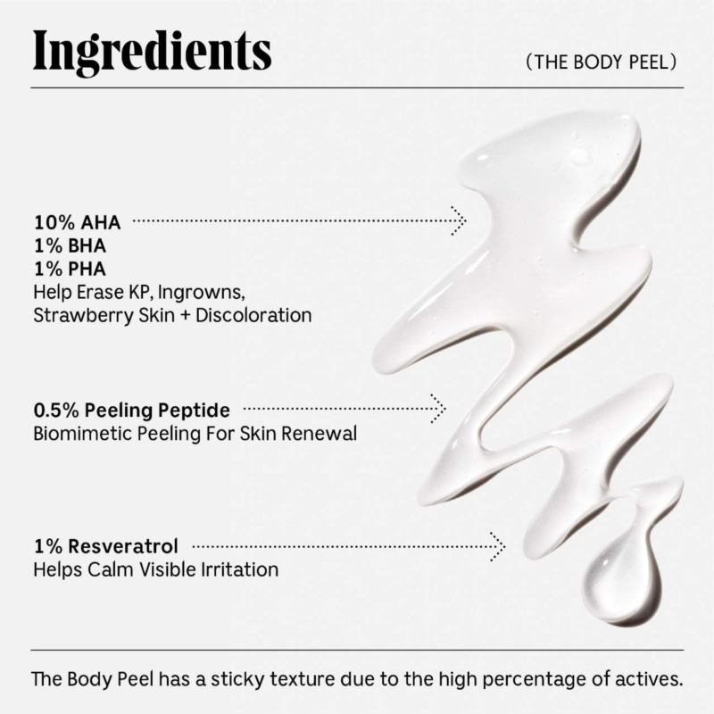 What Else You Need to Know: Skincare For The Body. A daily acid peel with 12% AHA/BHA/PHA ,1% Reserveratrol + Peeling Peptide to erase common texture and tone concerns. Helps treat and prevent KP, ingrowns, strawberry skin and discoloration for smoother skin. Leave-on. Dermatologist-Tested. Hypoallergenic. Non-Comeodegenic.