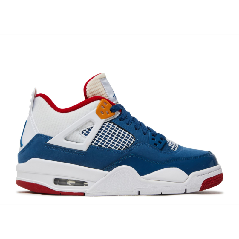 The Air Jordan 4 Retro GS ''Messy Room'' for older kids presents a playful design inspired by a child’s untidy living space. The upper in blue nubuck is lined with red textile with a matching synthetic leather overlay. The cushioned collar, netting on the quarter panel, and TPU support wings, which are adorned with molded orange eyelets, appear in white. Beneath the sneaker, a white foam midsole provides cushioning with a visible Air-sole unit atop a two-tone rubber outsole. The tongue and the heel tab display Jumpman branding.