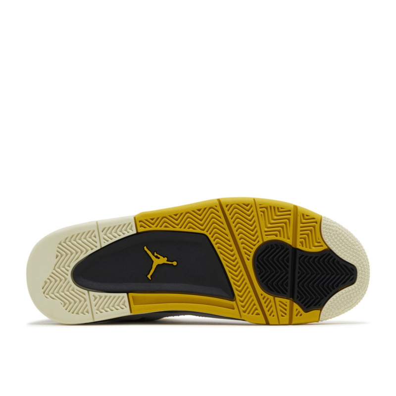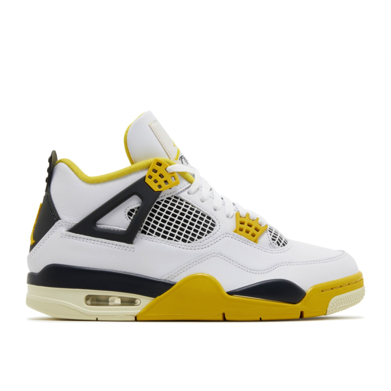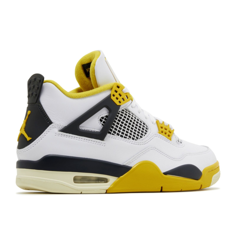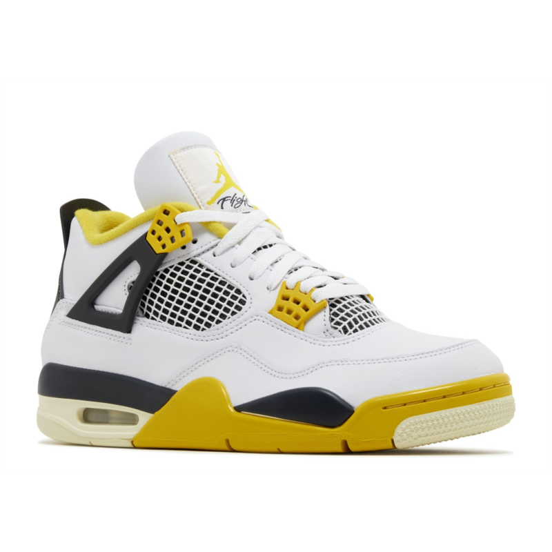 The Women''s Air Jordan 4 Retro ''Vivid Sulfur'' brings some of the signature AJ4 details like a breathable side netting and support wings for midfoot support. The smooth white leather upper gets contrasting yellow accents on the eyelets, lining, and Jumpman logos on the tongue and back tab. These shoes have a two-tone midsole, equipped with an exposed Air-sole unit inside the heel.