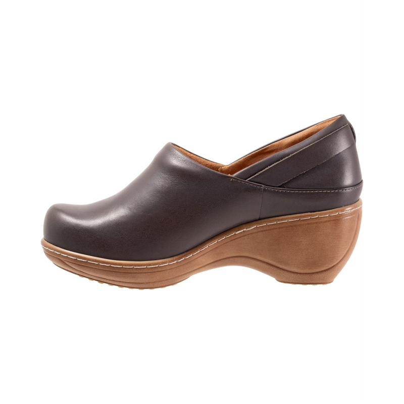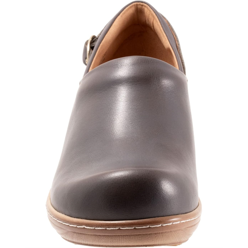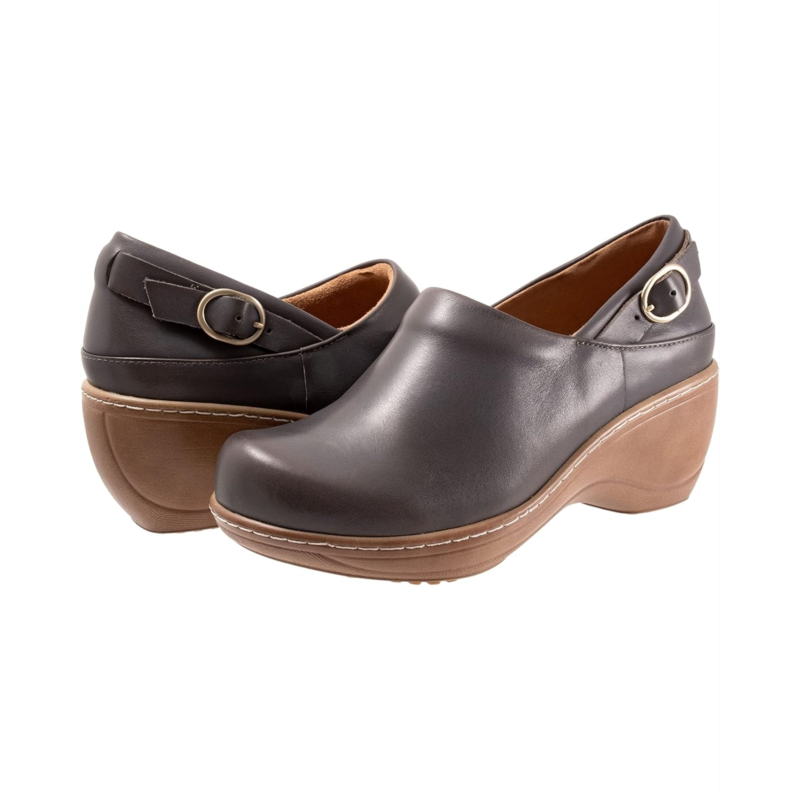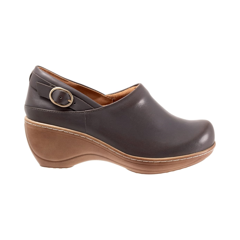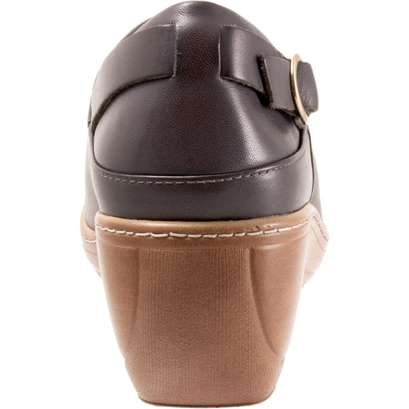 The Minna is a closed-back clog with a buckle ornament detail. A curvy platform wedge with faux wood treatment elevates the Minna and a padded collar and cushioned footbed keeps you comfortable.