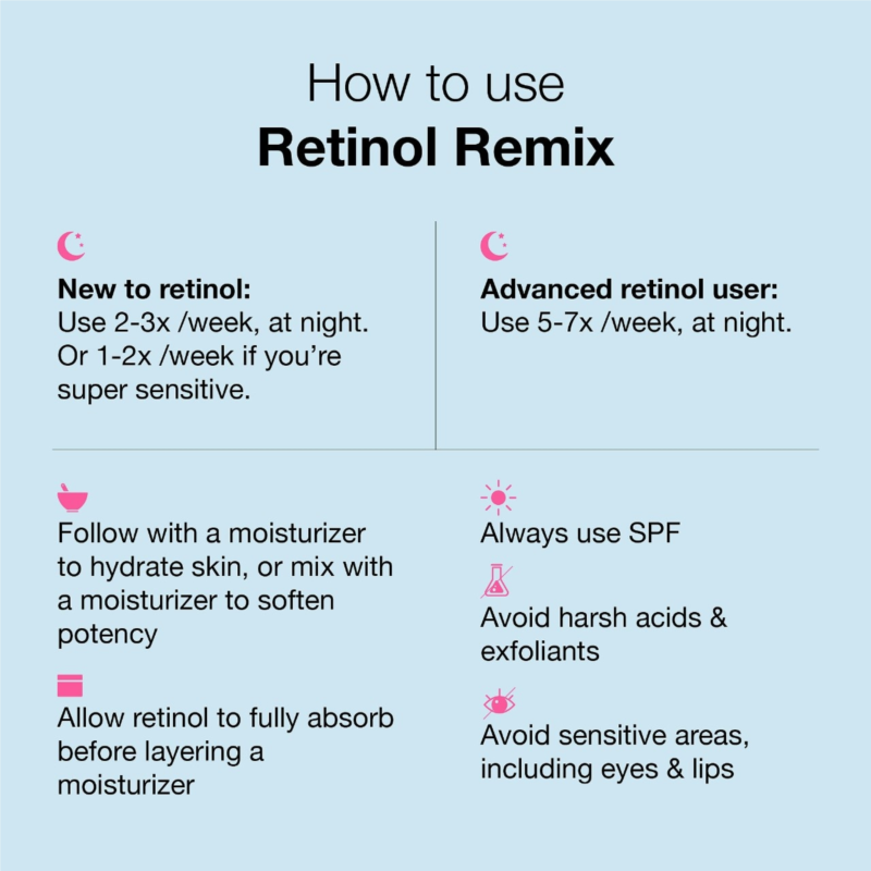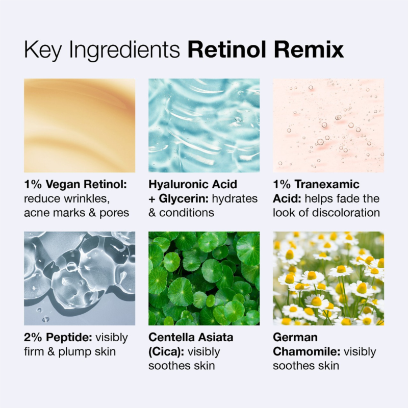 - Centella asiatica, Tazman Pepper, and German Chamomile: Visibly minimize signs of irritation, bumps, and flaking associated with retinol use.