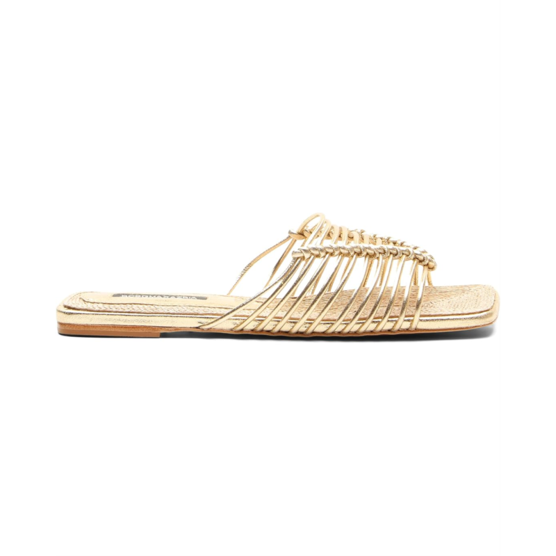 Flat sandals featuring strappy leather upper with rolled strap detailing.