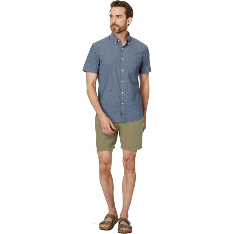 - Dress up your basic weekend look with the Faherty Short Sleeve Stretch Playa Shirt. This cotton shirt is constructed with a button-down collared neck, full button front closure, short sleeves, front left chest pocket and finished in an allover fish scale pattern to have your style noticed.