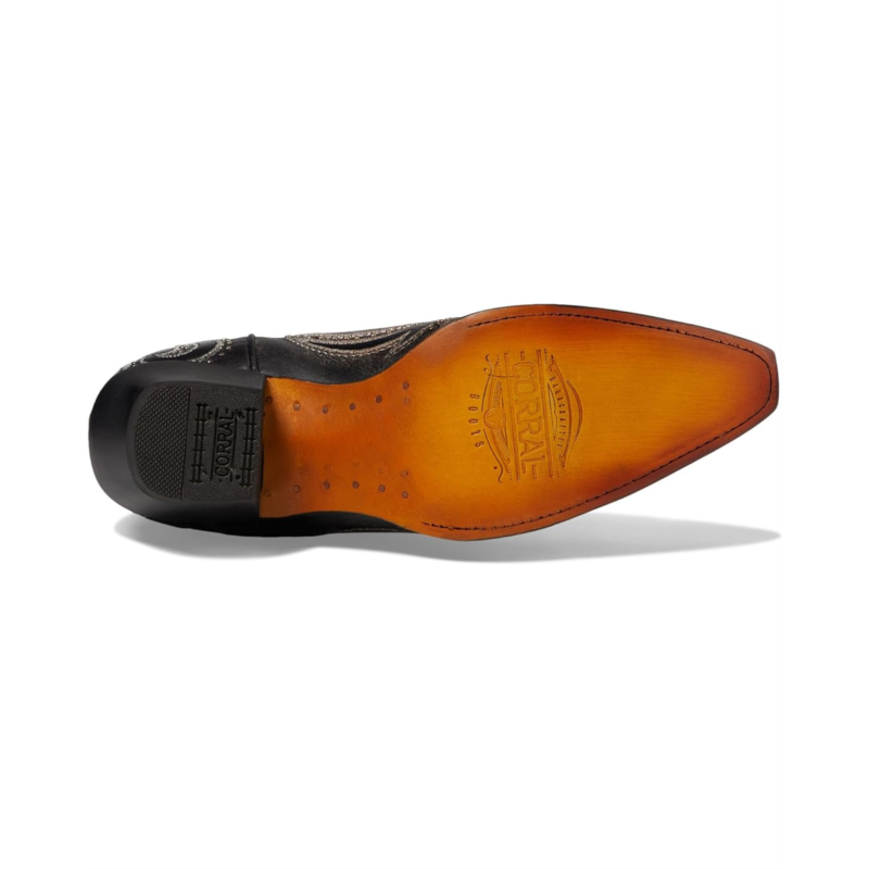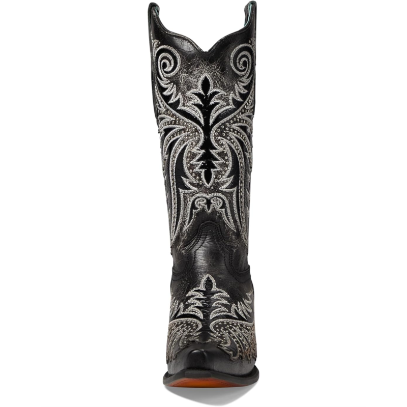 - Leave an impact with your dashing presence wearing the Corral Boots Z5209 that features embroidered and studded ornaments. The calf-high footwear has leather upper, lining and insole construction with side pull tabs fostering an easy pull-on style.