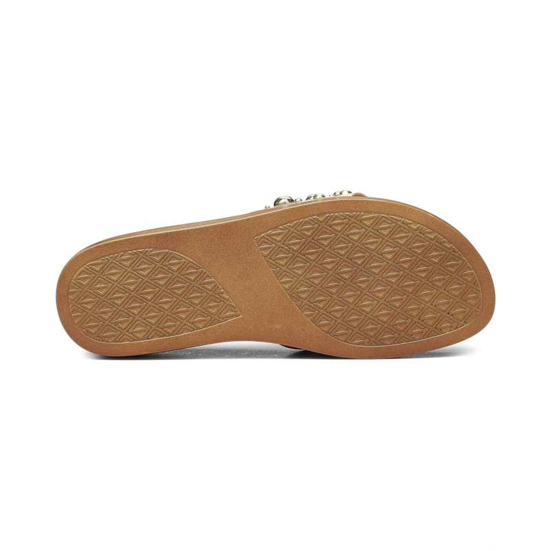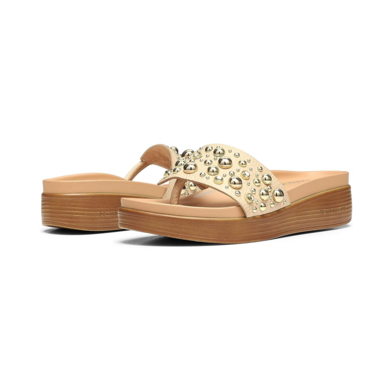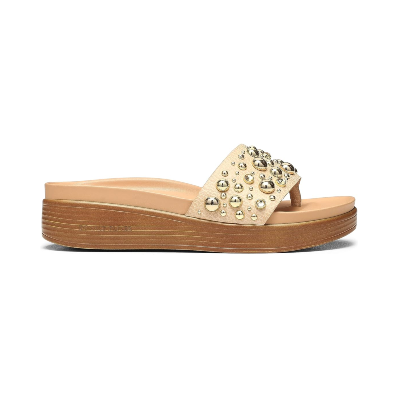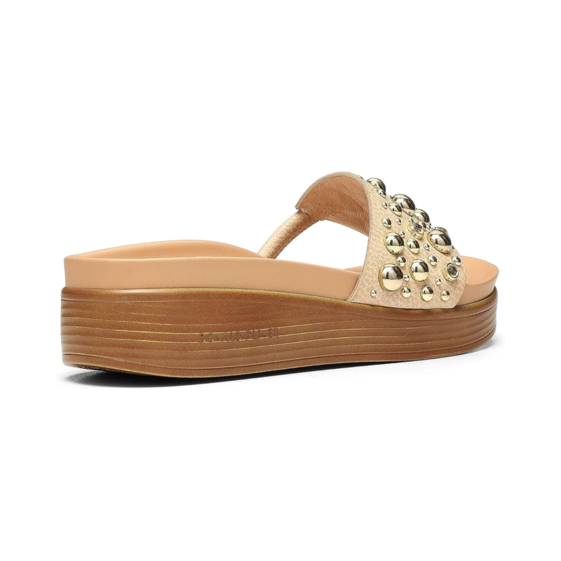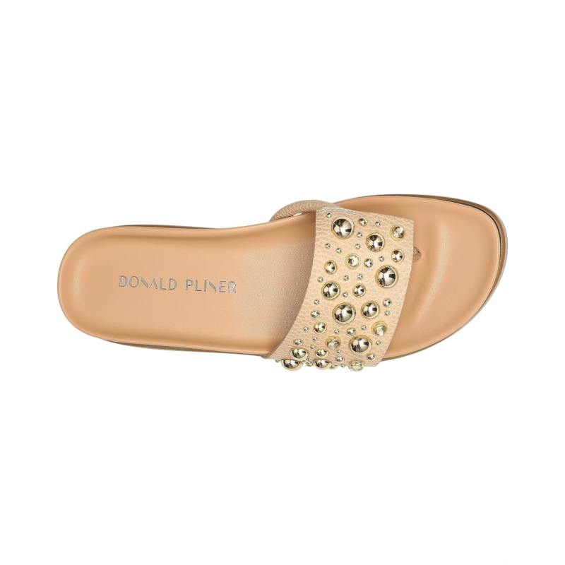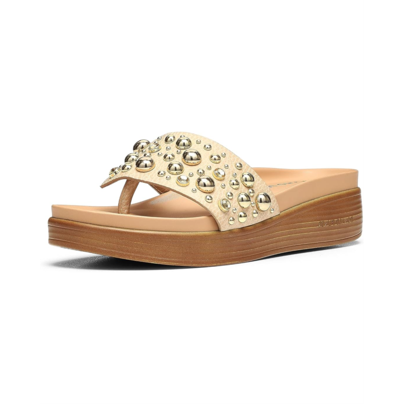 Filp flop in style of the studded Donald Pliner Fifi26Sp slip-on with wedge heels.