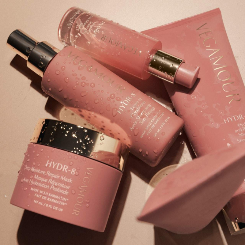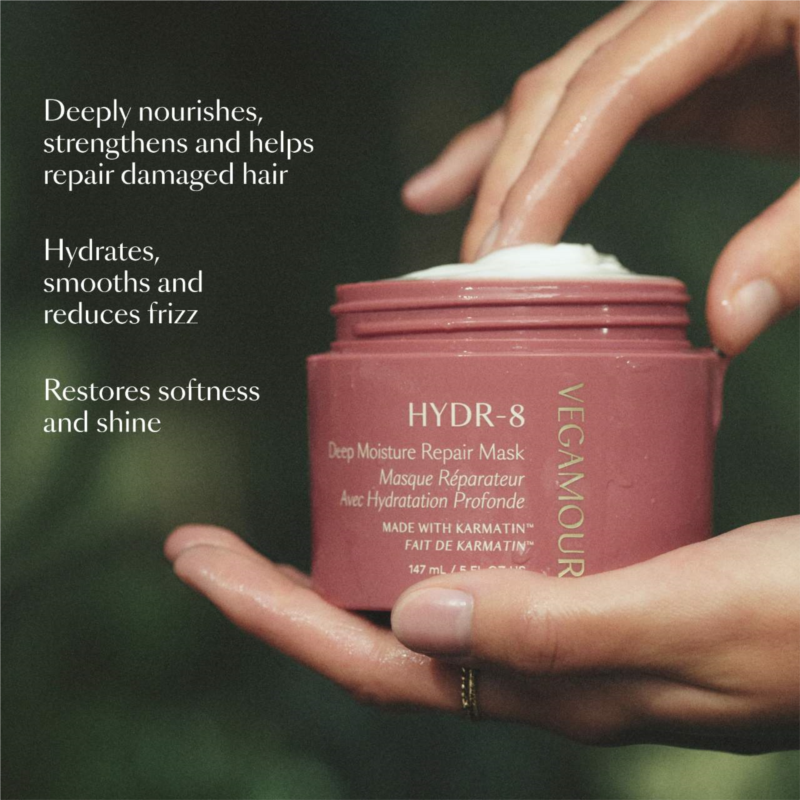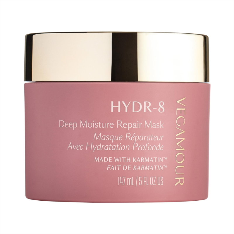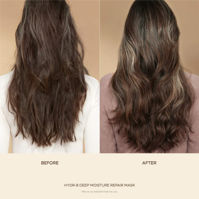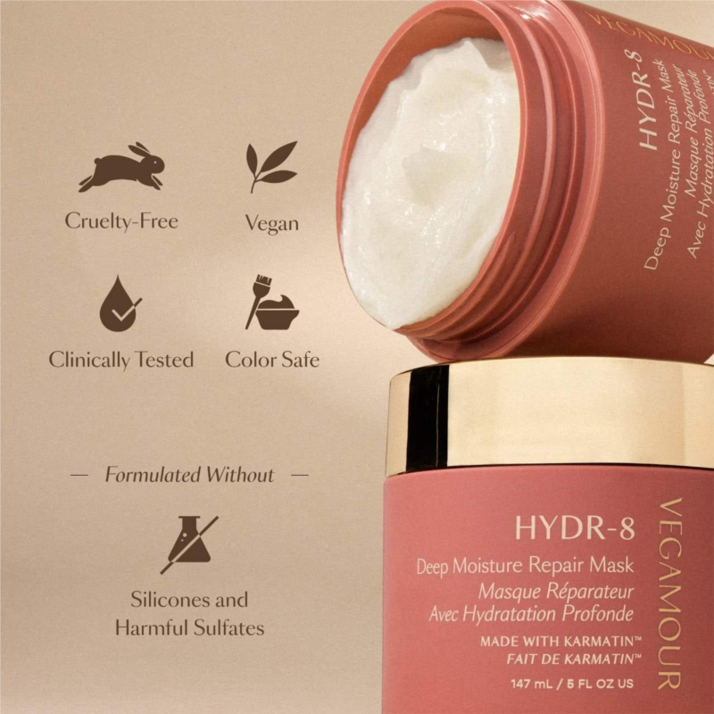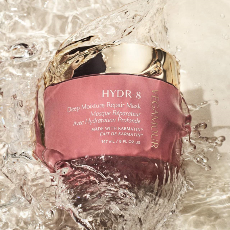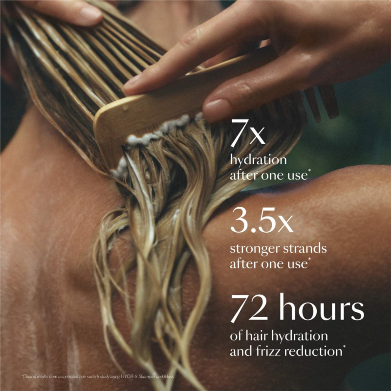 What Else You Need to Know: The HYDR-8 Mask provides eight key benefits: It regenerates and nurtures hair, reduces breakage and frizz, enhances shine, is color safe, and protects against environmental aggressors, all while providing up to 72 hours of hair hydration.* It’s also powered by Karmatin, a vegan silk alternative to keratin and silicone, that bonds to hair without rinsing away.