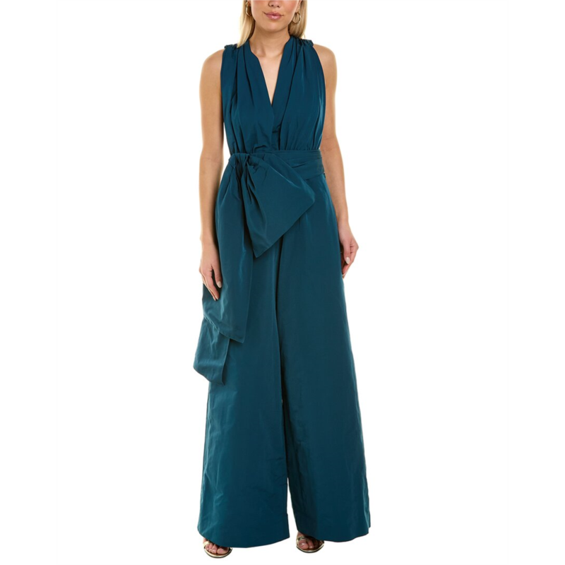 - Wide Leg Jumpsuit In Peacock With Pleated Plunging Bodice, Side Seam Pockets, Bow Detail, And Pleated Waist
