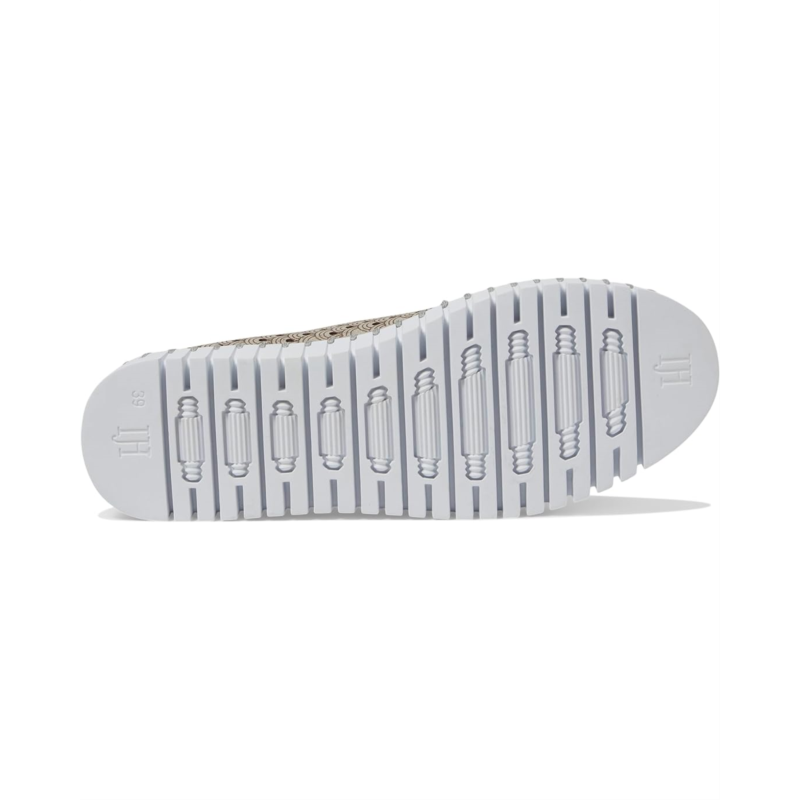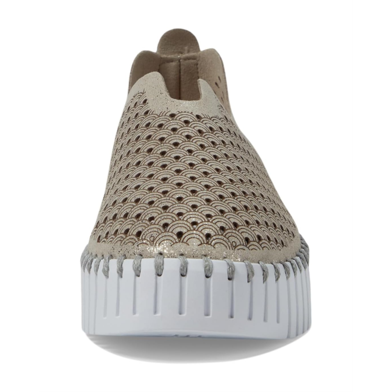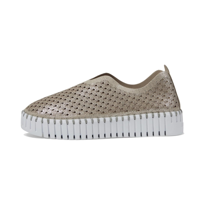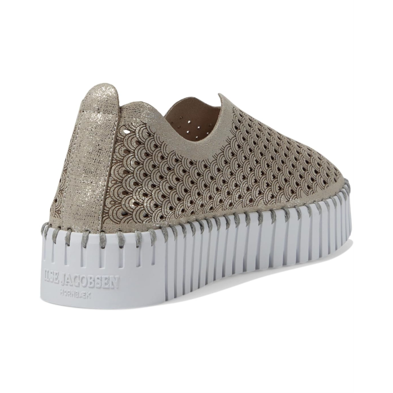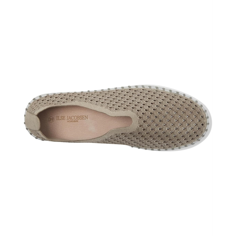 - The Ilse Jacobsen Tulipu 0023 shoes are crafted with an upper of recycled microfiber that features glimmer and a captivating laser-cut pattern, perfectly blending style and eco-friendly design. These casual shoes feature an iconic Tulip outsole that is made from 75% natural rubber and 25% recycled rubber and is expertly stitched with matching recycled thread and entirely glue-free inside. The pig suede-lined insole provides remarkable comfort through added padding and support while the faux suede lining provides added comfort. Elevate your footwear collection with these pull-on shoes.