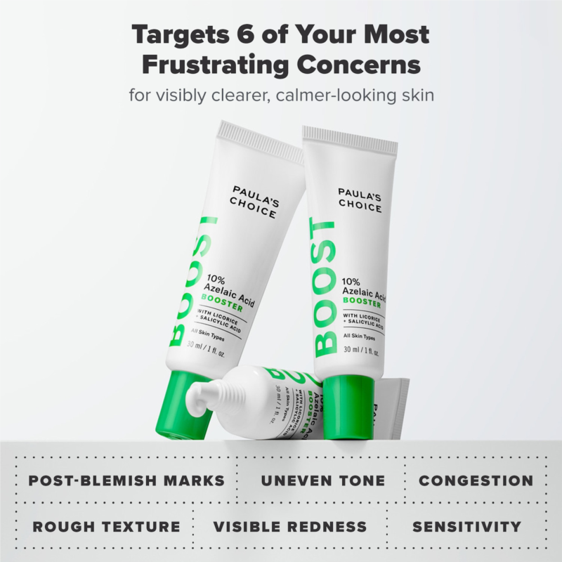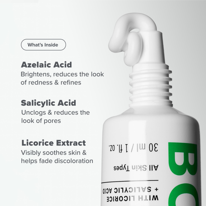 What Else You Need to Know: Powered by a potent blend of research-backed azelaic acid, salicylic acid (BHA), and visibly brightening botanicals, this multitasking formula combats the look of redness and blotchiness while fading the appearance of stubborn marks left behind from acne breakouts. Ongoing use can visibly diminish bumps and blemishes.