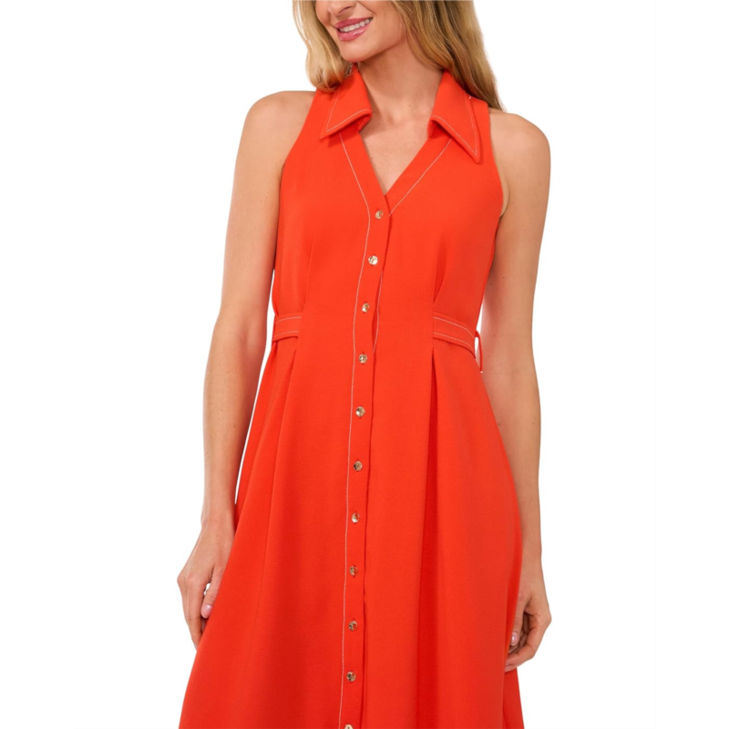 The CeCe Sleeveless Belted Waist Midi Dress is perfect for those who want to look chic without compromising comfort. Pair it with sandals or sneakers during the day, or dress it up with heels and statement jewelry for a more formal evening ensemble. The midi dress features a gauzy crepe fabrication, collared V-neck, sleeveless design, button-front closure, belt detail on the waist, solid pattern, and a fit-and-flare silhouette.