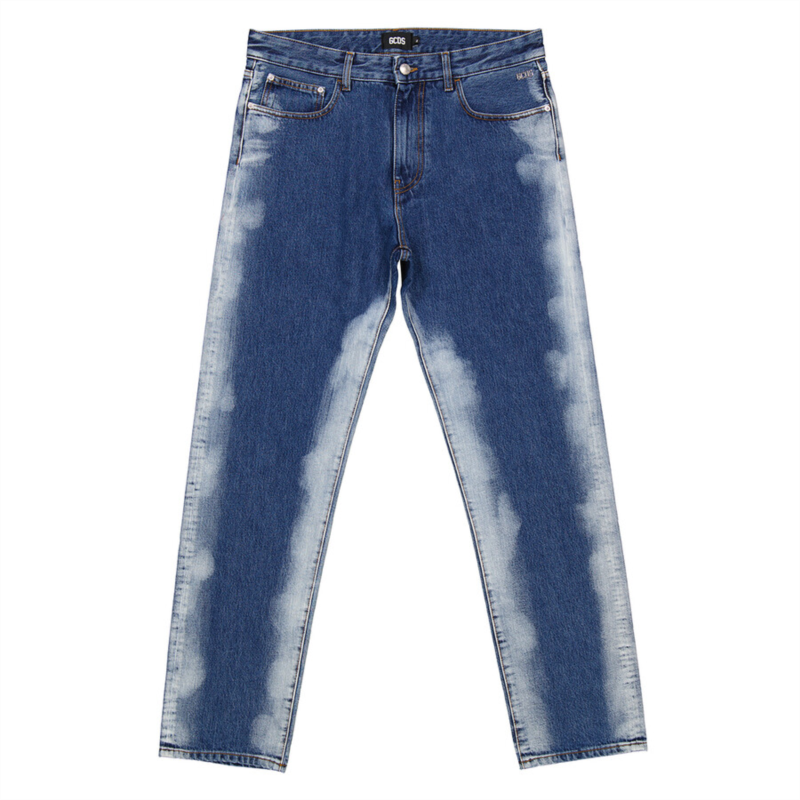 GCDS Men''s Bottoms. Fashion category: Jeans & Denim. SKU: FW23M350004. Color: New Light Blue. GCDC Denim Black Straight Jeans. This black jeans from are crafted from denim with a medium rise and a bleached distressed finish. They feature contrasting tobacco stitching and are accented with a GCDS logo choker at the back of the waist. This jeans have a straight-cut silhouette.100% cotton. Made in Italy.