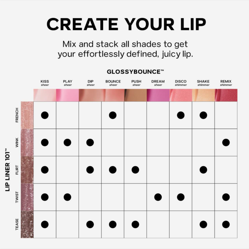 What Else You Need to Know: Lip Liner 101’s silky formula glides on smoothly for a framed lip with a soft-matte finish. No tugging, tightness, feathering or dryness due to nourishing ingredients like meadowfoam oil, jojoba seed oil, and shea butter. The five versatile shades are designed to pair perfectly with your favorite gloss? like Glossybounce (sold separately).