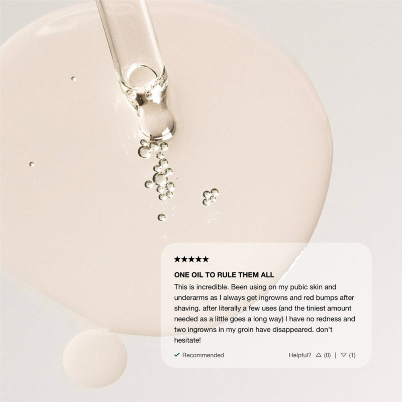 What Else You Need to Know: Expertly developed body oil specifically for ingrown hairs ? blended with naturally derived oils including tamanu oil to soften skin and pubic hair, bisabolol to reduce visible redness, and jojoba oil and rosehip oil to soothe and smooth. Apply to bikini line, armpits, legs, or anywhere that needs extra care or is prone to dryness, including elbows, and cuticles for smooth, soft skin.?